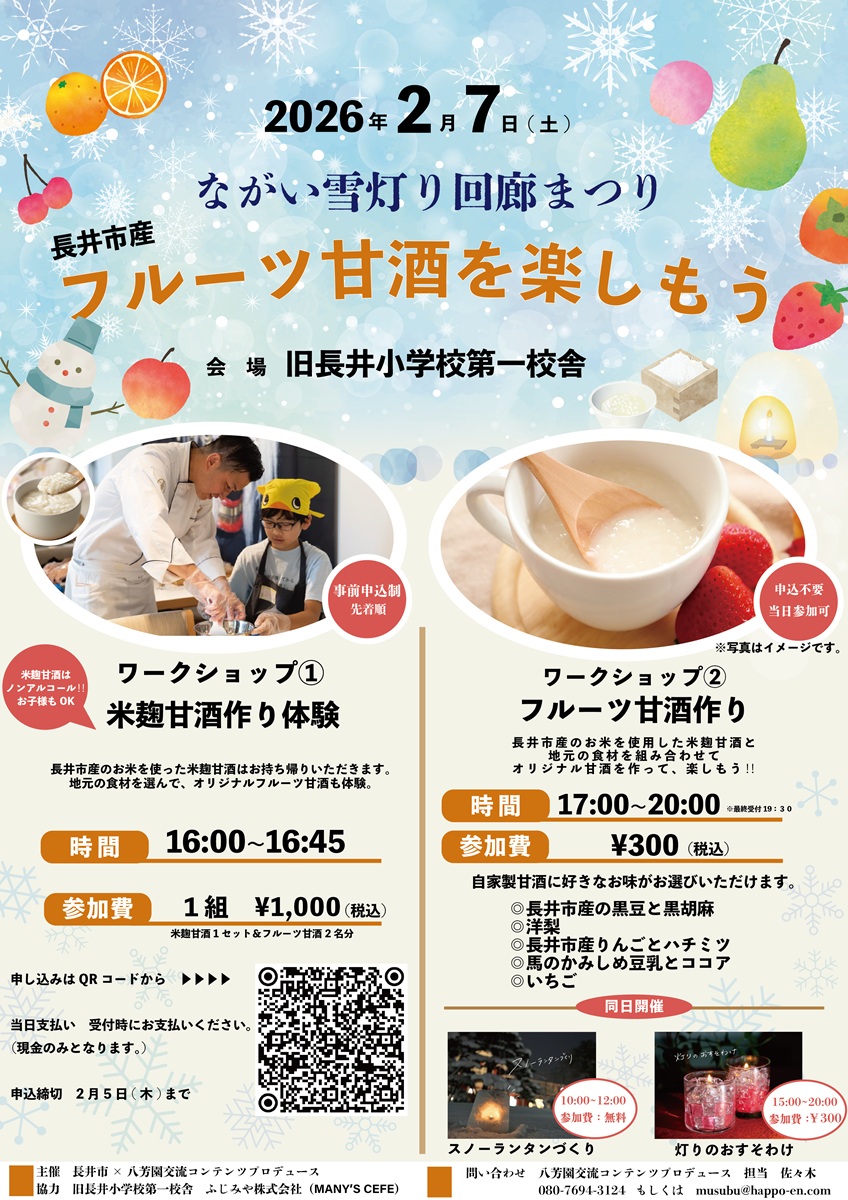 雪灯り回廊まつり2026に合わせて、甘酒づくりを体験できるワークショップが開催されます。